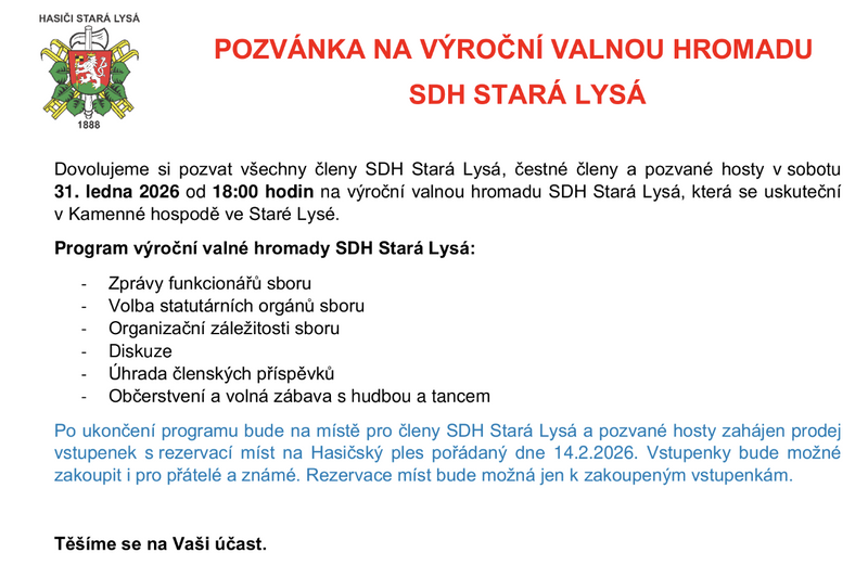 🔥 POZVÁNKA NA VÝROČNÍ VALNOU HROMADU SDH STARÁ LYSÁ 🚒