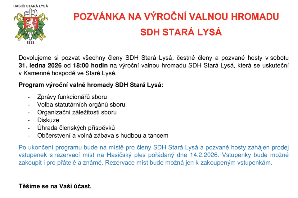 Sbor dobrovolných hasičů ve Staré Lysé vás srdečně zve na Hasičský ples, který se uskuteční